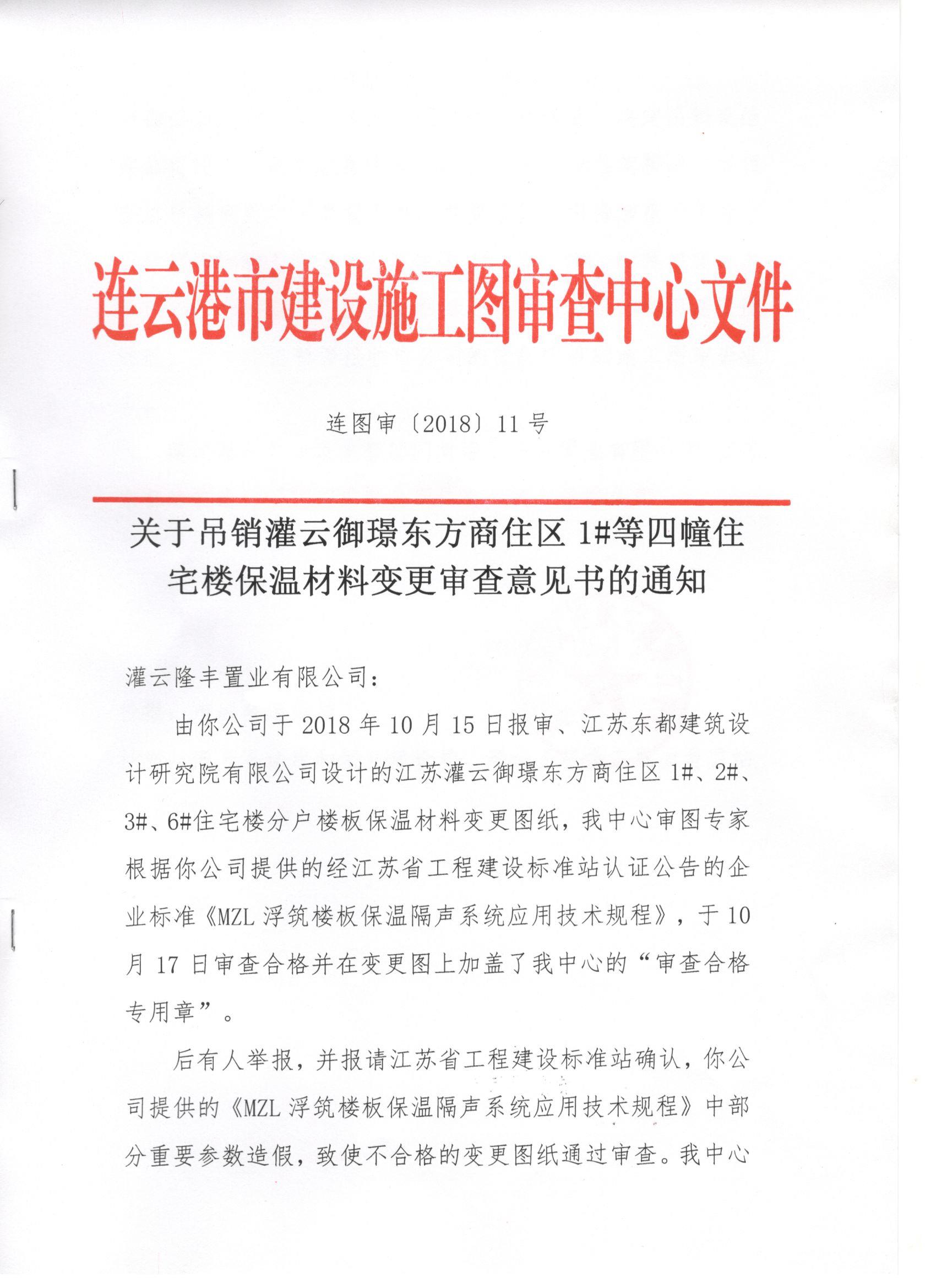 关于吊销灌云御璟东方商住区1#等四幢住宅楼保温材料变更审查意见书的通知