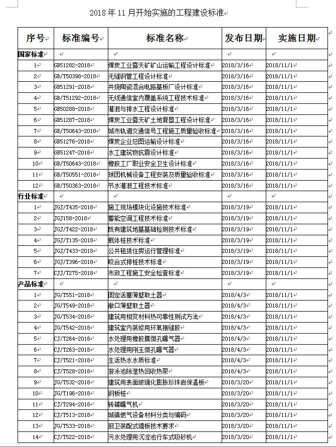 2018年11月开始实施的工程建设标准
