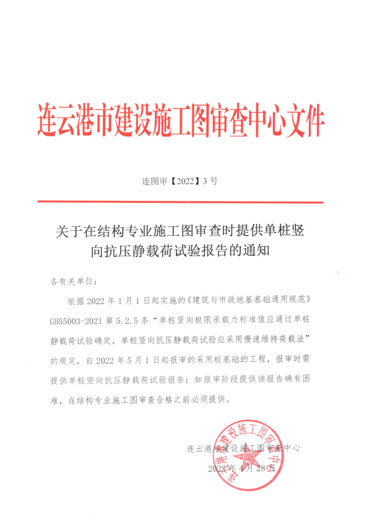关于在结构专业施工图审查时提供单桩竖向抗压静载荷试验报告的通知