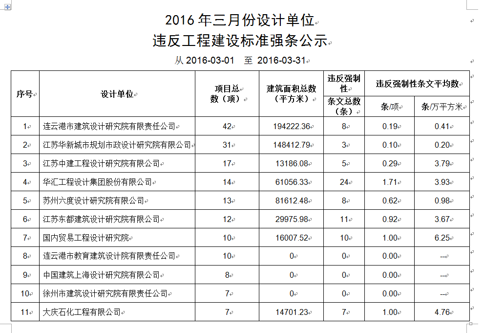 2016年3月份设计单位违反强条公示
