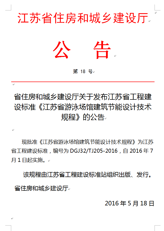 关于发布江苏省工程建设标准《江苏省游泳场馆建筑节能设计技术规程》的公告