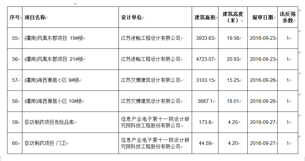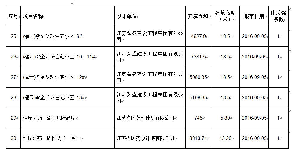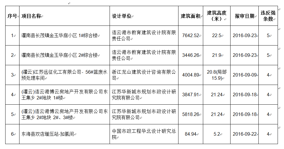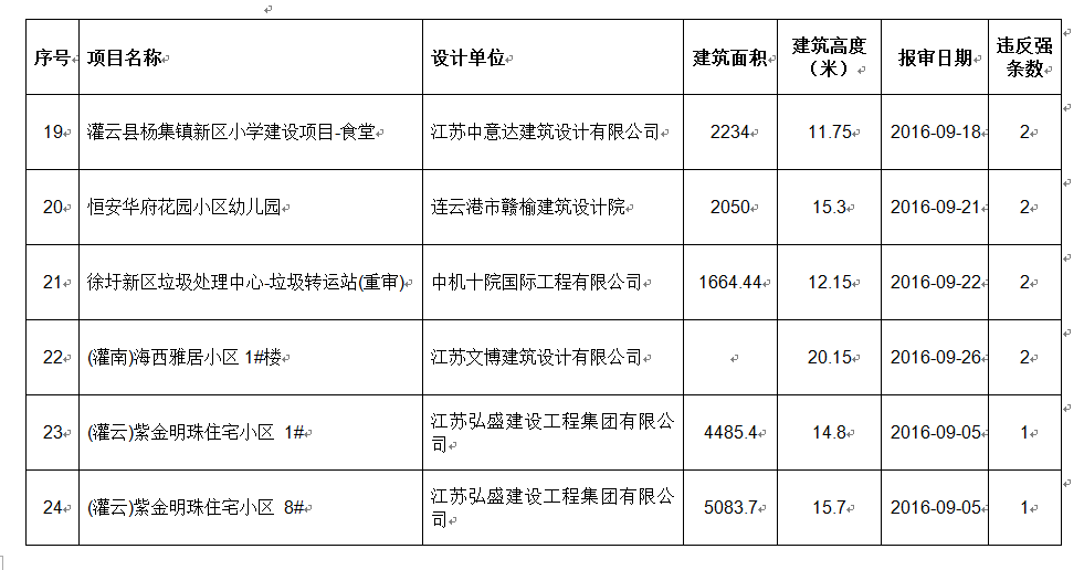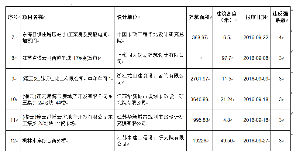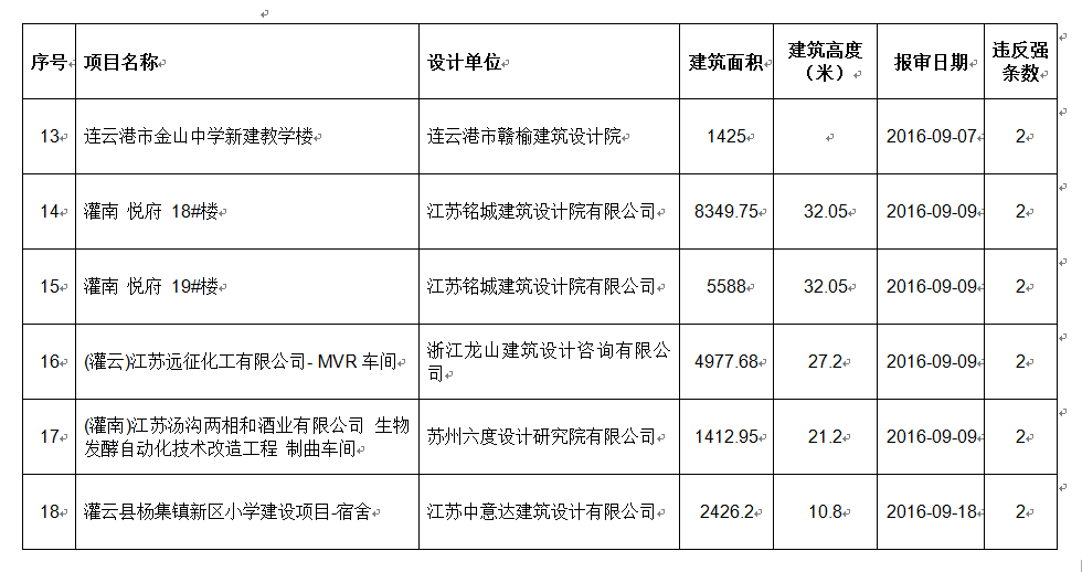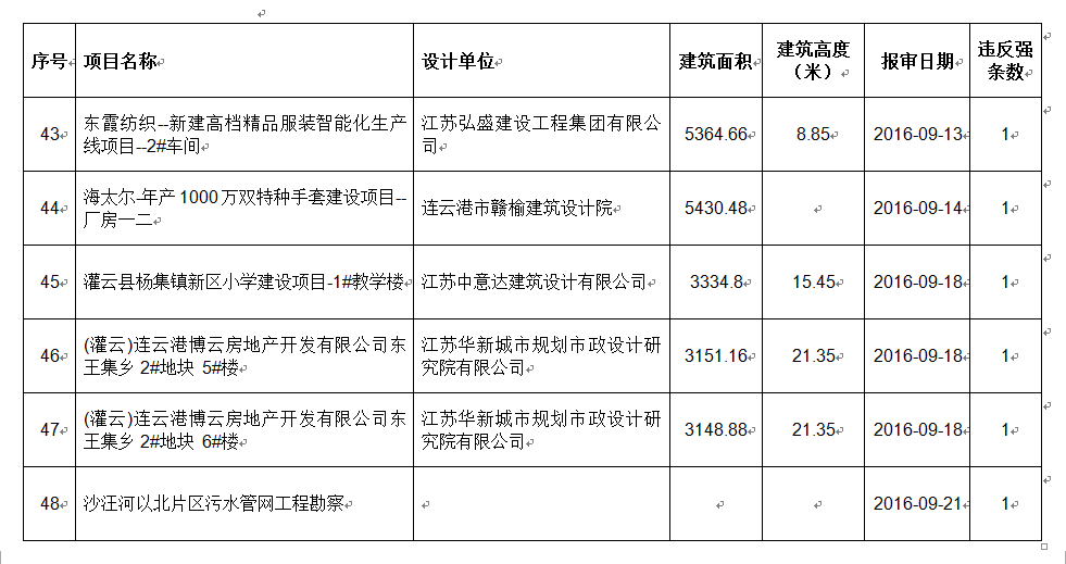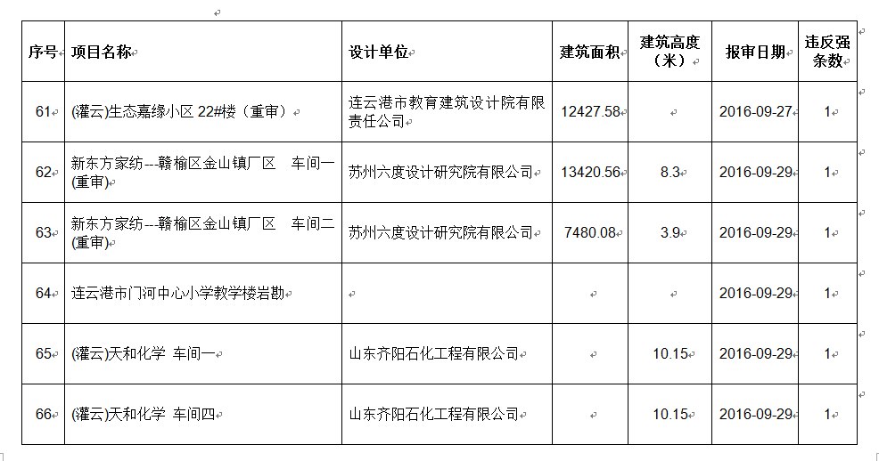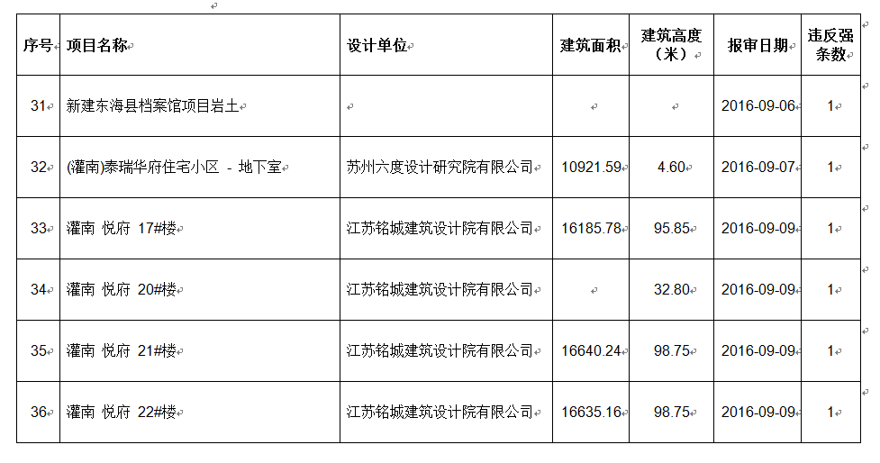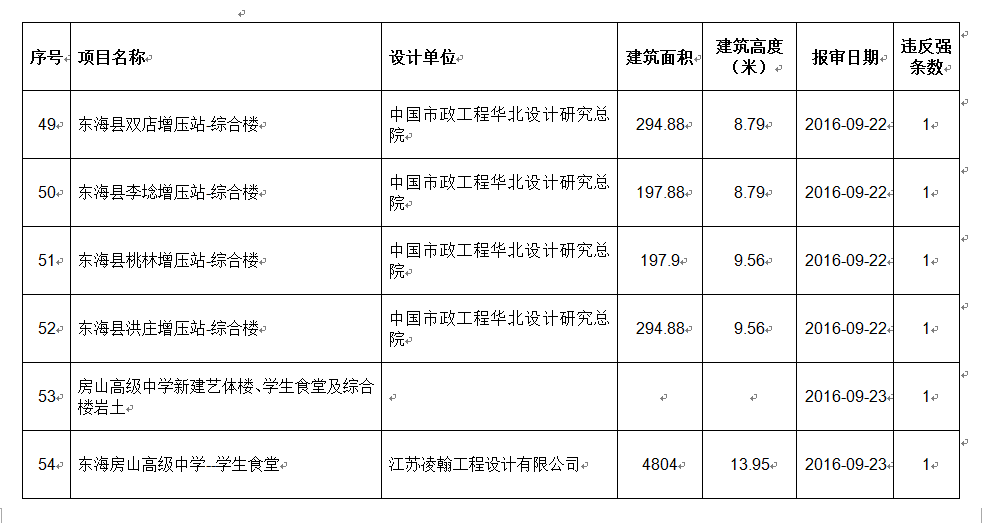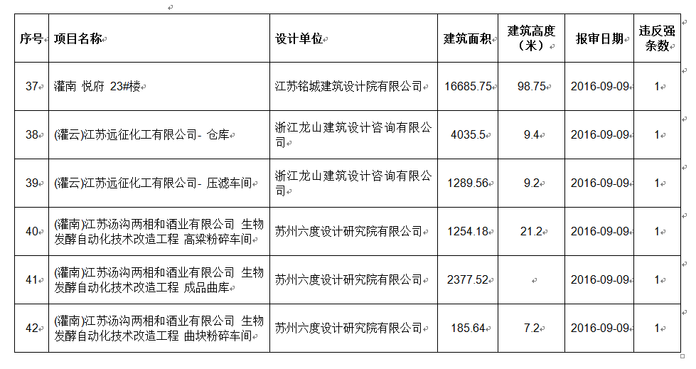 2016年9月份建设项目违反工程建设标准强条公示