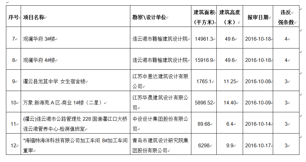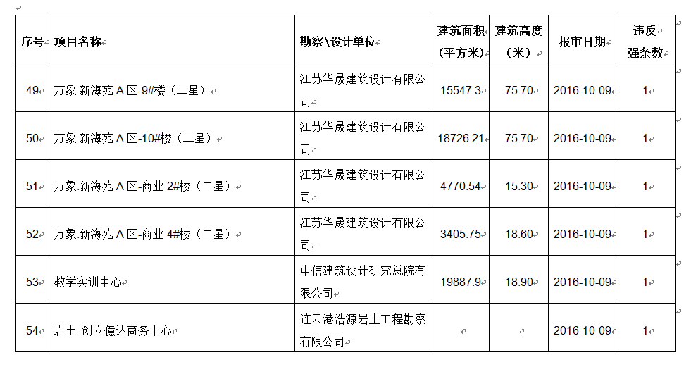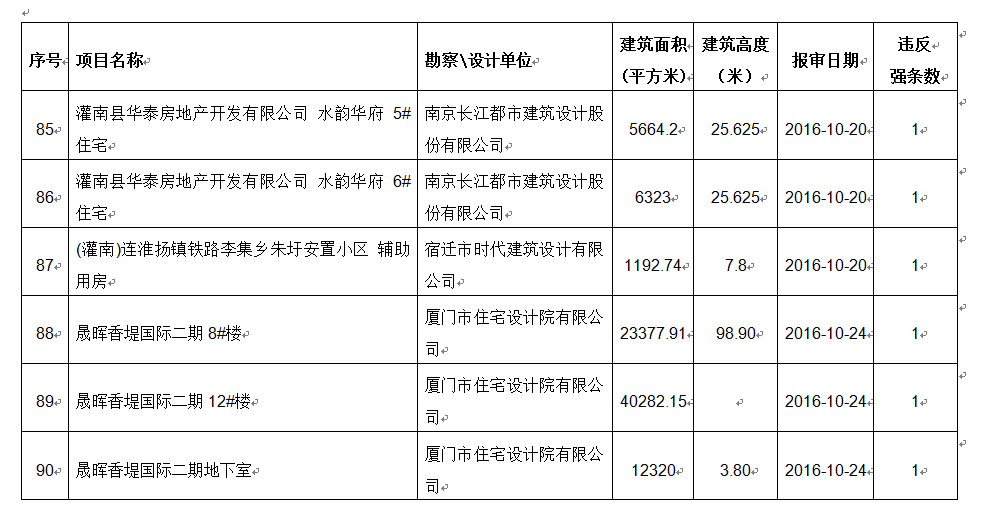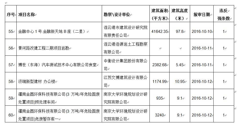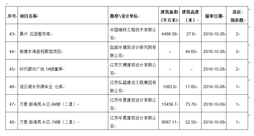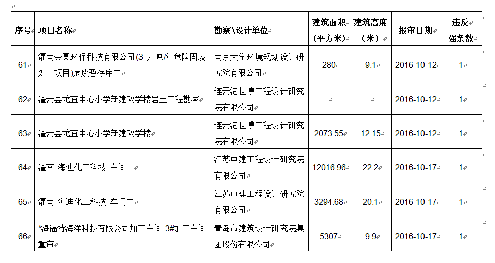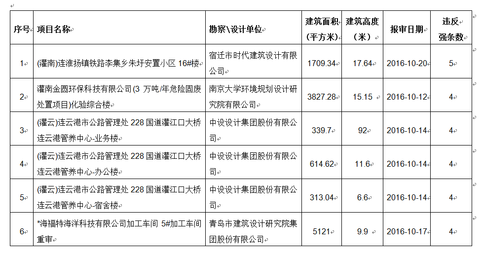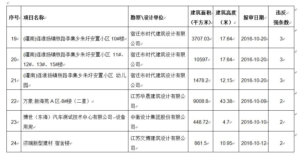 2016年10月份建设项目违反工程建设标准强条公示