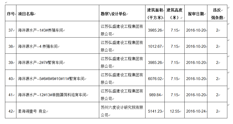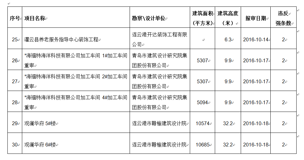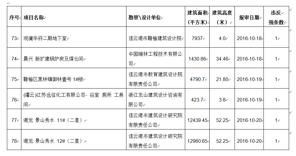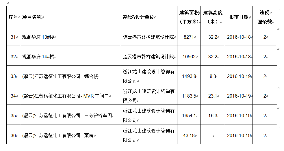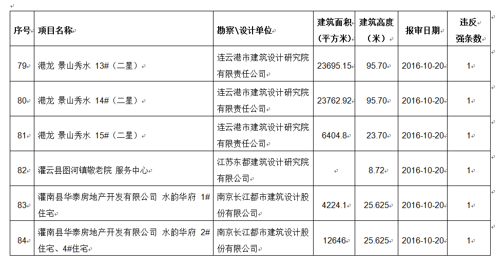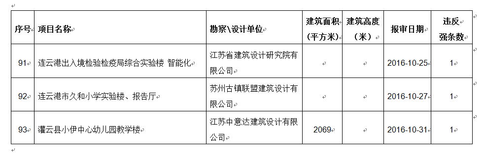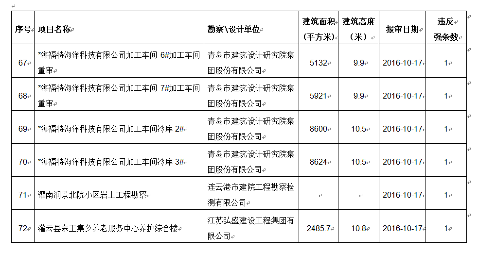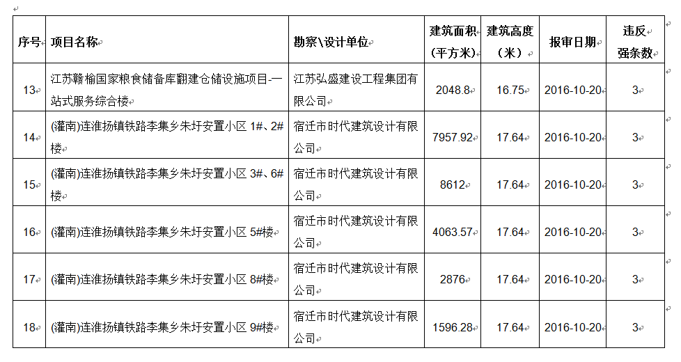 2016年10月份建设项目违反工程建设标准强条公示